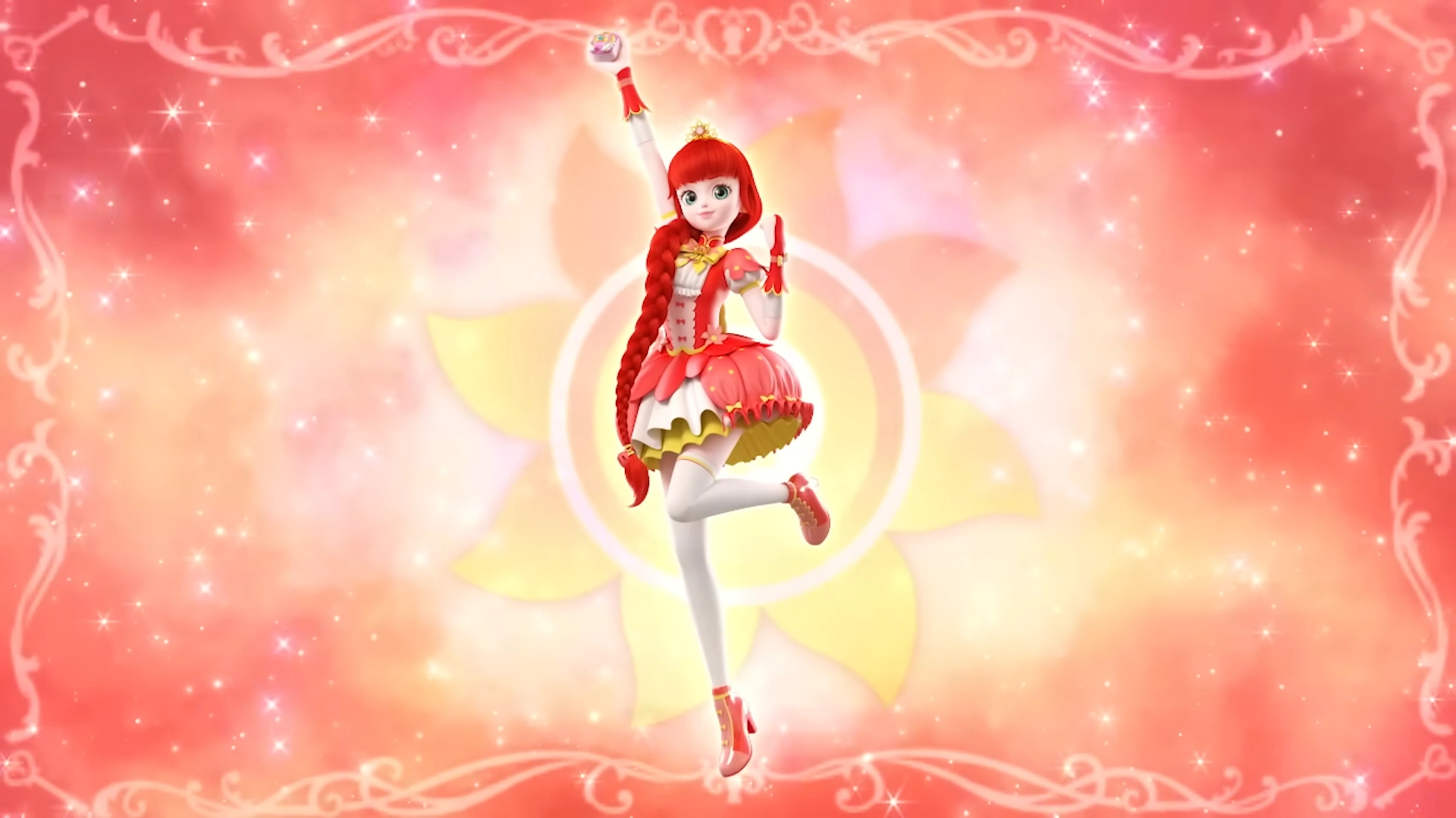 With Nanaping, Romi transforms into a red with orange and yellow accents sun-themed princess representing Passion, whose devise is "For your passionate heart!". Her hair becomes red and is rearranged into a single braid style, and she gets bright emerald green eyes, and she wears the red round bulge dress skirt with mini yellow flower pattern. She is similar to Princess Sunshine in theme and color.