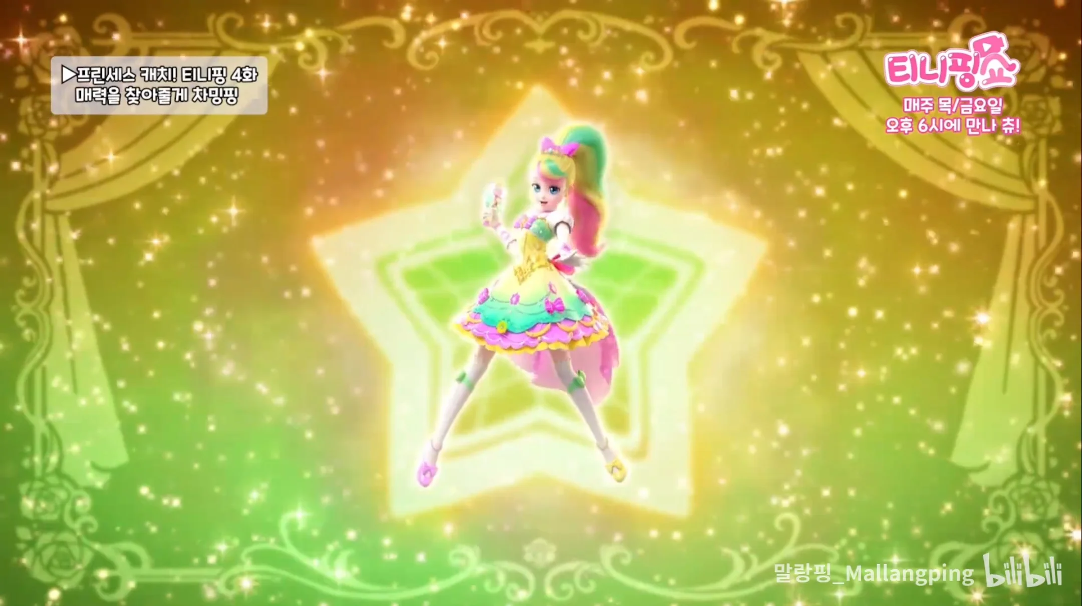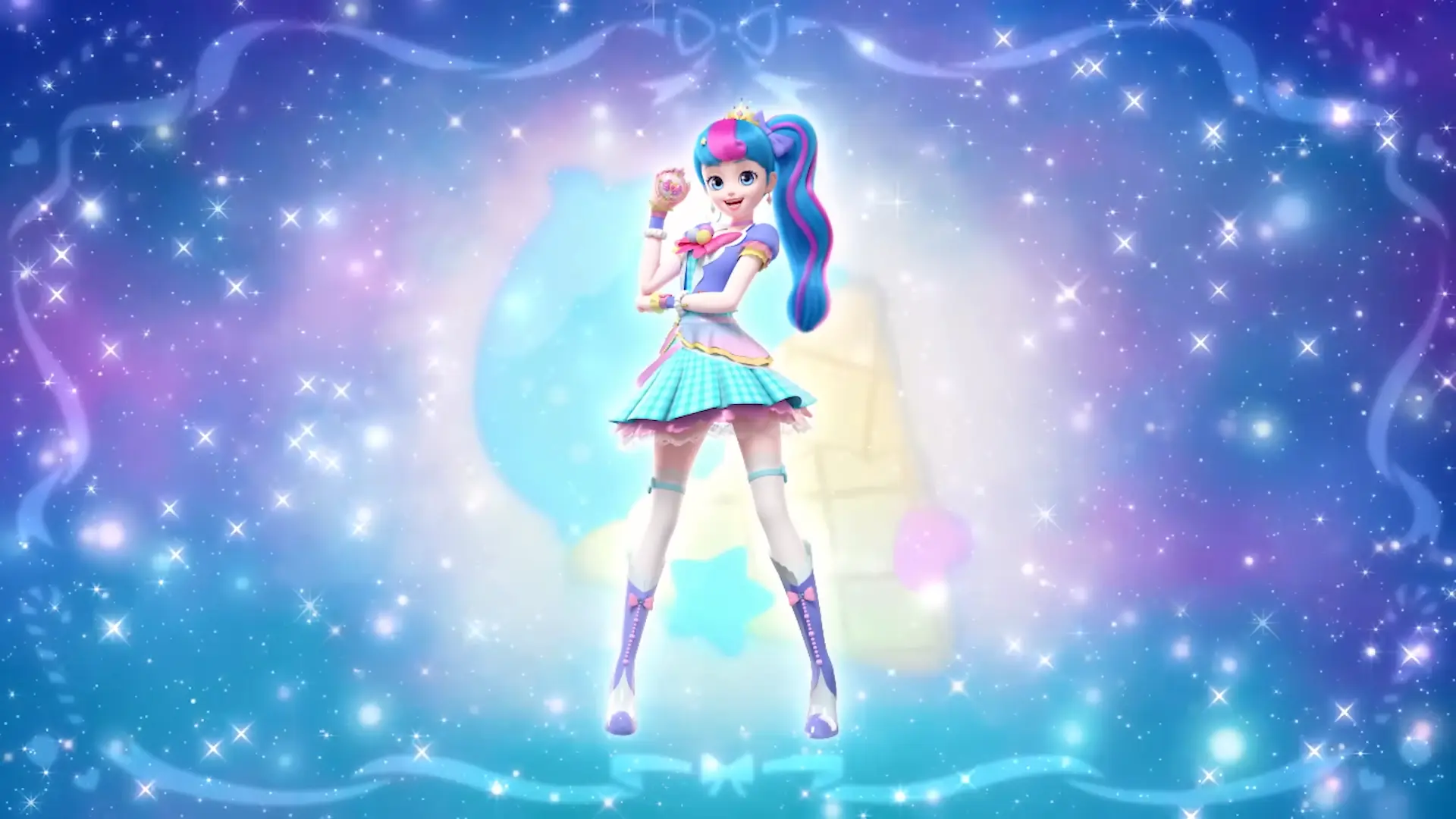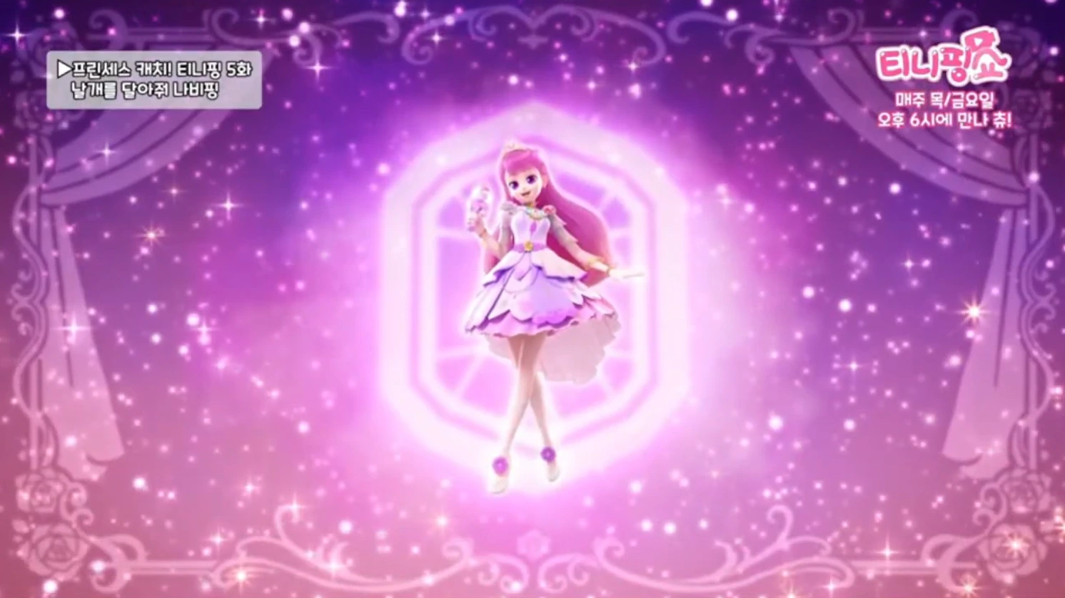 In Star Catch! Teenieping, Romi transforms with the help of Heartsping and three new Royal Star Teeniepings into a space-themed princess.